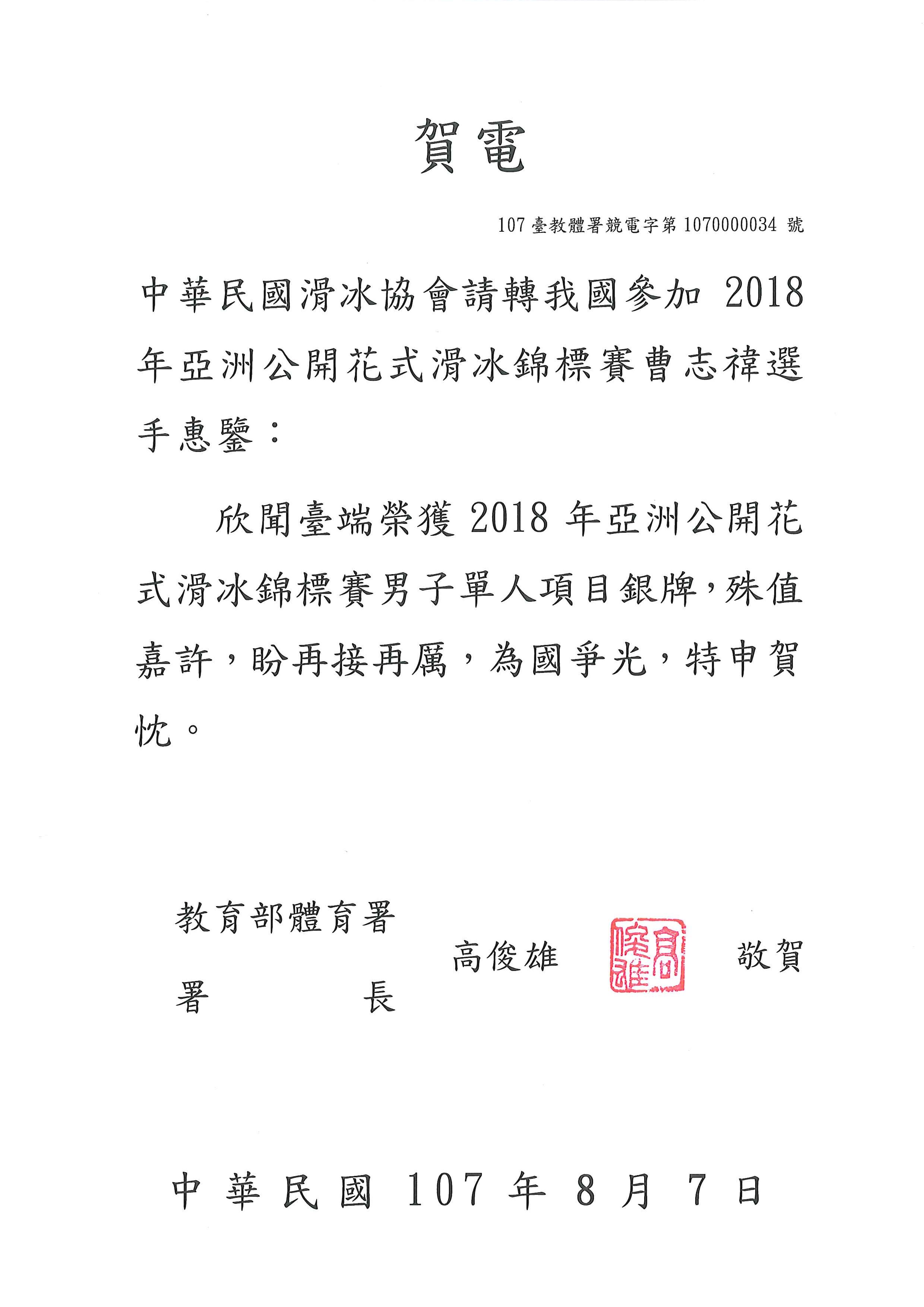教育部體育署高署長祝賀曹志禕勇奪銀牌為國爭光 【中華民國滑冰協會公告】 恭喜曹志禕勇奪「2018 ISU CS挑戰者系列賽」SENIOR MEN組銀牌。 Previous Article 107年度大道競速滑冰C級教練講習會-簡章/課程表/報名表 Next Article 107學年度全國短道競速滑冰錦標賽公告