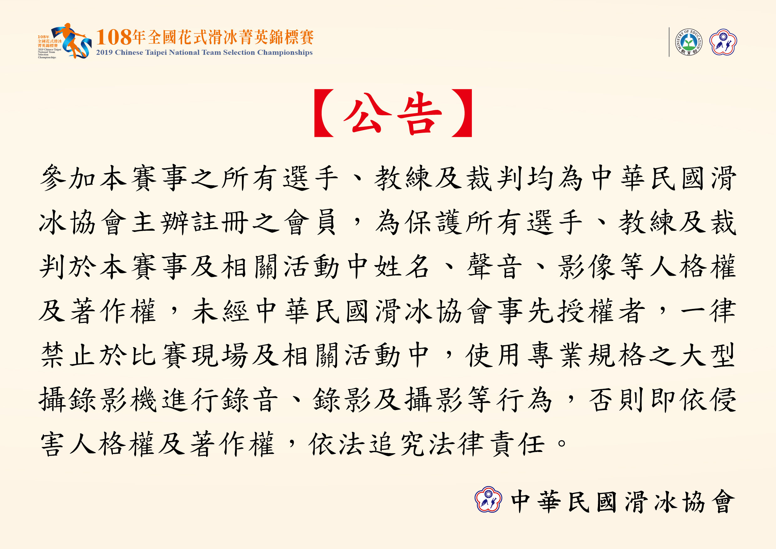 108年全國花式滑冰菁英錦標賽-攝錄影規定公告 【中華民國滑冰協會公告】 108年全國花式滑冰錦標賽-公告-1.jpg (1548 downloads ) Previous Article 108年全國短道競速滑冰春季錦標賽-成績 Next Article 108年全國花式滑冰菁英錦標賽-攝(錄)影申請表