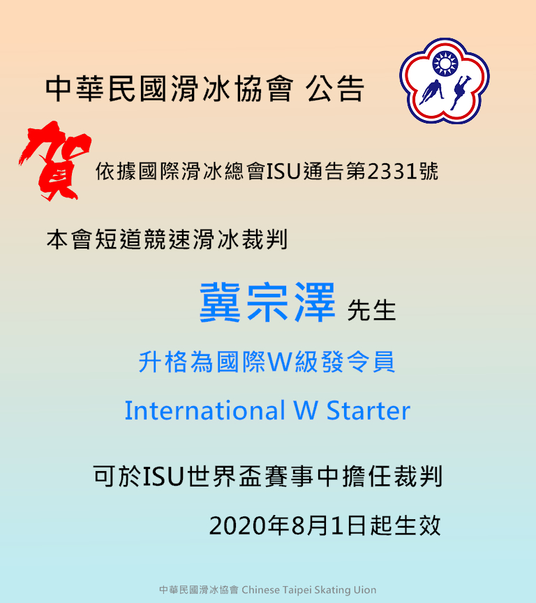 【公告】賀!本會短道競速滑冰裁判冀宗澤老師升格為國際W級發令員 Previous Article 【國際】【技術規則】花式滑冰男/女子及雙人最新技術規則停用 將沿用舊規則 Next Article 2020-2021賽季花式滑冰國家代表隊選拔辦法