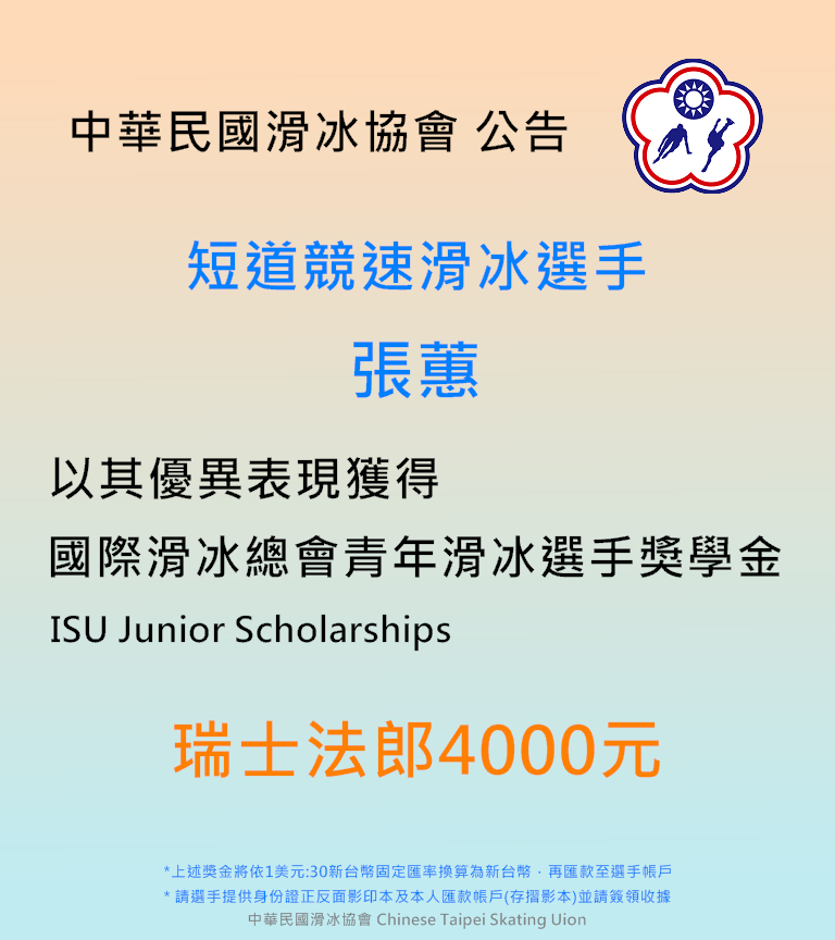 【公告】恭喜短道競速滑冰選手張蕙小姐,榮獲國際滑冰總會青年滑冰選手獎學金4000瑞士法郎 本會恭賀張蕙小姐獲得國際滑冰總會青年滑冰選手獎學金(ISU Junior Scholarships)並誠摯地祝福妳未來成功。 Previous Article 【公告】恭喜花式滑冰選手丁子涵小姐,榮獲國際滑冰總會青年滑冰選手獎學金5000瑞士法郎 Next Article 【國際】短道好手Elise Christie越挫越勇 走過憂鬱低潮重新出發