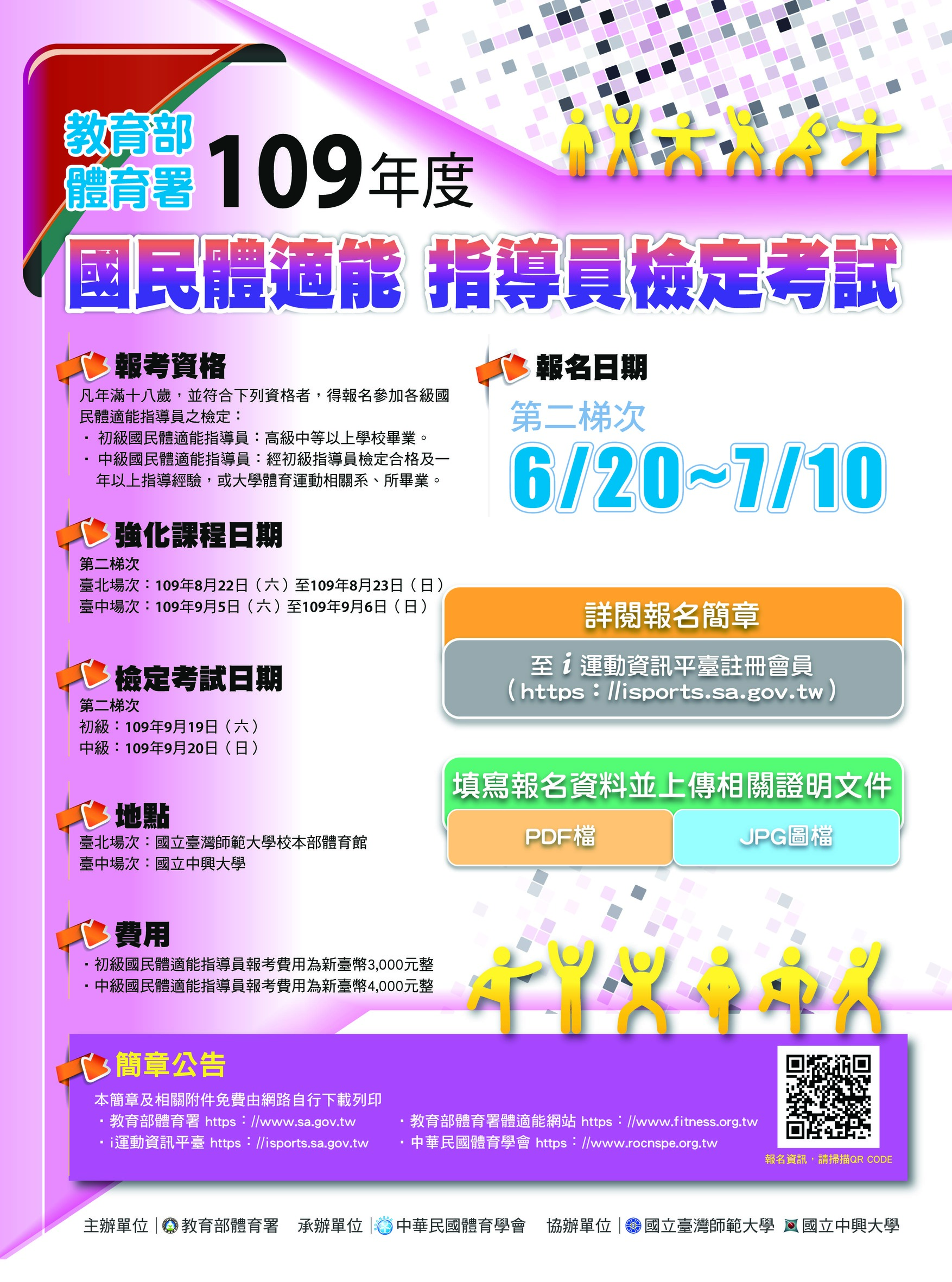 【公告】109年度國民體適能指導員檢定-第二梯次109/09/19-20 【公告】教育部體育署109年度國民體適能指導員檢定-第二梯次109/09/19-20 報名簡章下載: 109簡章-指導員授證檢定考試第二梯次 Previous Article 【國際】受2008北京奧運啟發 安凱立志成為運動員 Next Article 【公告】109年全國短道競速滑冰夏季錦標賽--競賽規程、註冊及報名網址