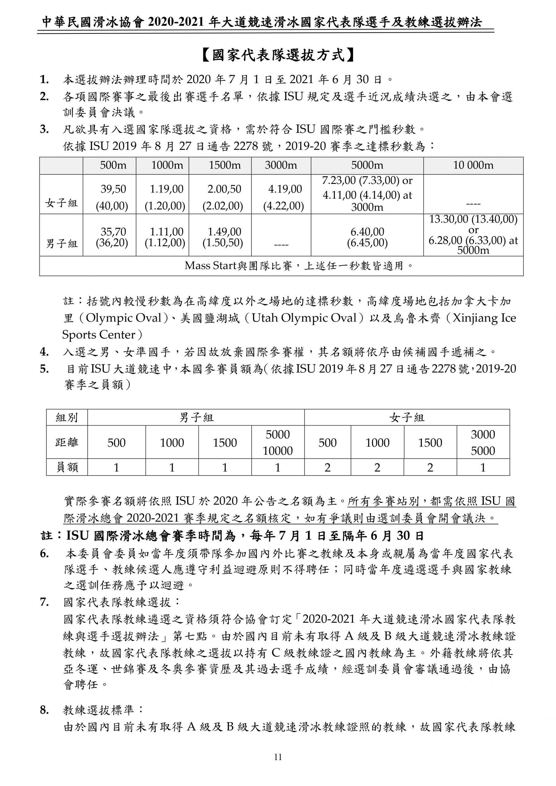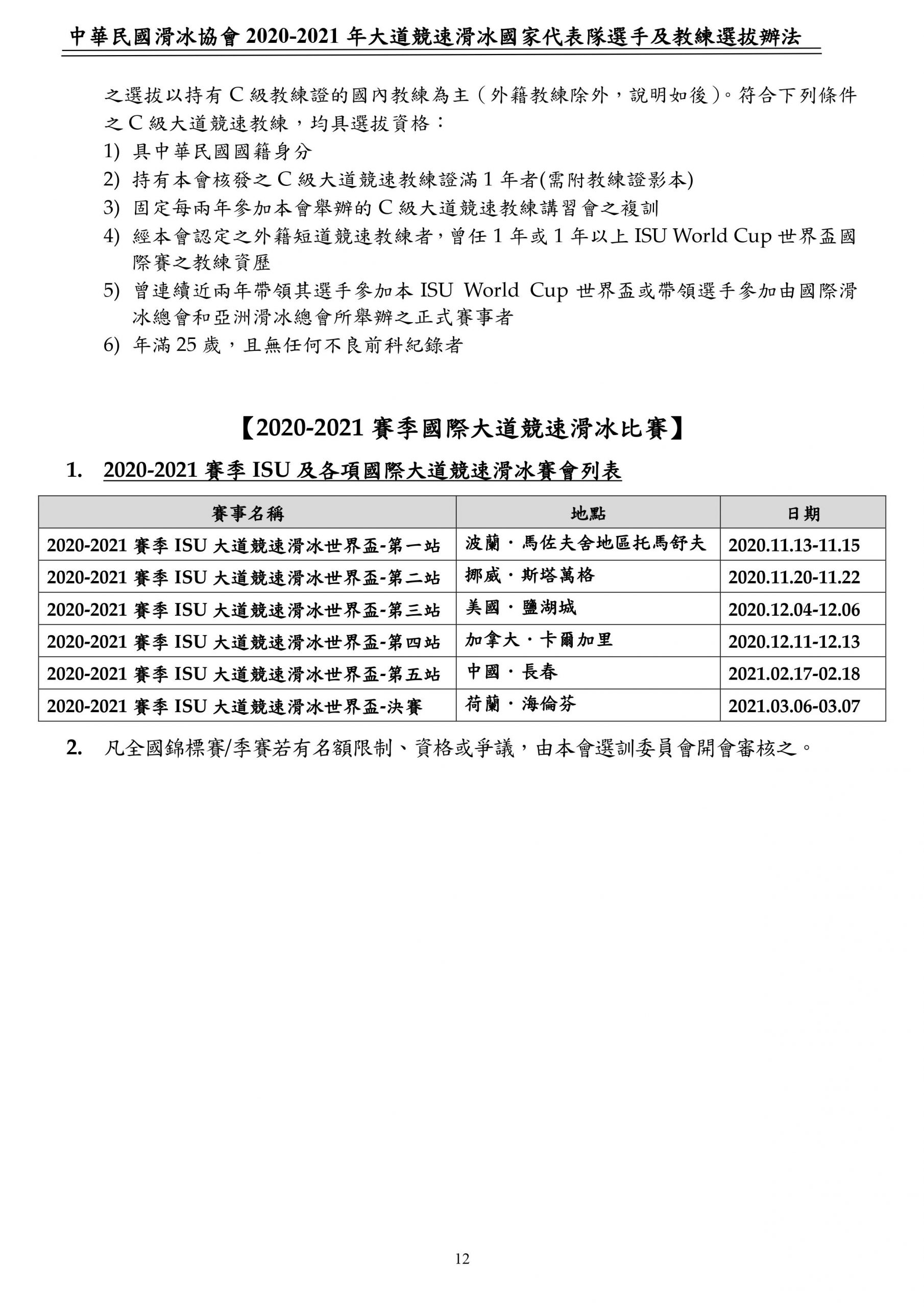 【公告】2020-2021年賽季大道競速滑冰國家代表隊選拔辦法 【公告】2020-2021年賽季大道競速滑冰國家代表隊選拔辦法 依據教育部體育署「國家代表隊教練與選手選拔培訓及參賽處理辦法」辦理,經臺教體署競(三)字第1090020476號函備查 2020-2021大道競速滑冰國家代表隊選拔辦法-12020-2021大道競速滑冰國家代表隊選拔辦法-2 2020-2021年賽季大道競速滑冰國家代表隊選拔辦法pdf檔下載:2020-2021賽季大道競速滑冰國家代表隊選拔辦法 Previous Article 【公告】2020-2021年賽季短道競速滑冰國家代表隊選拔辦法 Next Article 【轉知】有關內政部警政署提供優秀運動選手短期職務代理工作