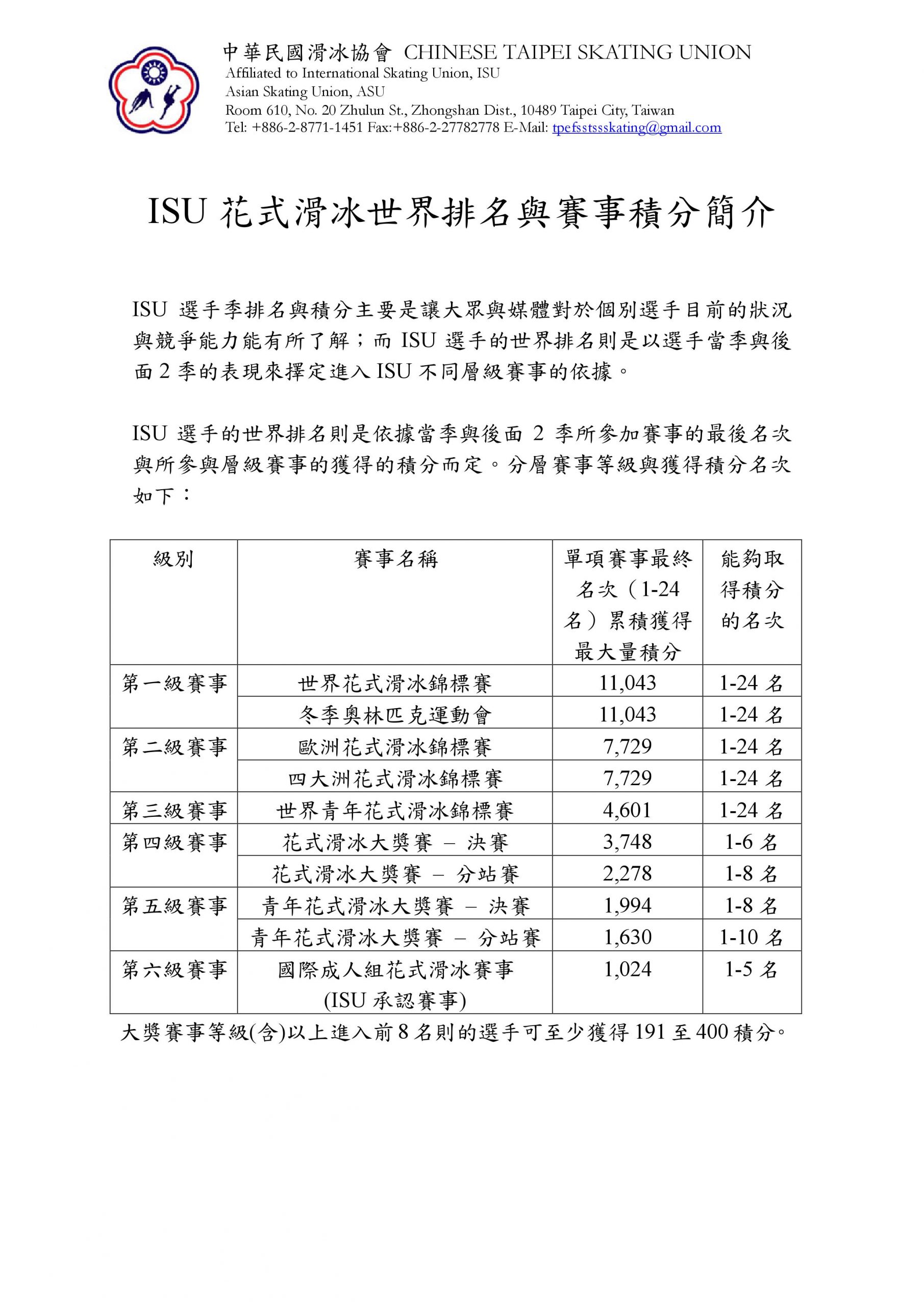【公告】國際花式滑冰排名與賽事積分說明 ISU 國際花式滑冰世界排名與賽事積分查詢網址: https://www.isu.org/figure-skating/entries-results/standings 以上資料為INTERNATIONAL SKATING UNION(ISU)提供之最新資訊 Previous Article 【公告】2020年運動禁藥清單 Next Article 【公告】中華民國滑冰協會109年常年會費繳費公告-2020-01-02