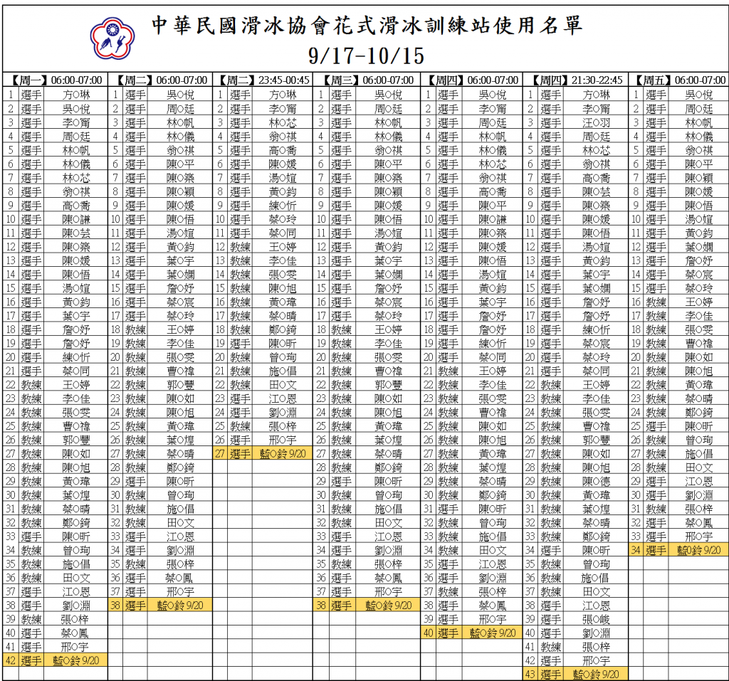 【協會公告】中華民國滑冰協會花式滑冰訓練站9/17起相關規定 今日起(9/17)將開放9/23-10/15花式滑冰訓練站使用登記,請符合資格但沒有在使用名單上的教練及選手們於 9/21 17:00 前,完成填寫附件防疫健康聲明調查書後,點選表單連結進行登記,原於名單內者則無需填寫。表單連結:https://forms.gle/PSZgKrhfqWGEZ9E 【注意!!】依據台北市政府體育局最新防疫公告,請教練及選手們務必遵守以下事項。1.請確實配合入場量體溫、消毒、實聯制並戴口罩。2.場域容留人數為50人。(教練及選手以外,非相關人士請勿滯留於館內)3.訓練期間須全程配戴口罩(完全遮蔽口鼻)。4.出境者自返國隔日算起,完成 14 天居家檢疫及 7 天自主健康管理後,始得入場館訓練。 9/17-10/15 中華民國滑冰協會花式滑冰訓練站使用名單*黃色標示為該員可進場日期。 Previous Article 110年大道競速滑冰C級教練講習會 Next Article 【協會公告】中華民國滑冰協會花式滑冰訓練站9/23至10/15使用名單