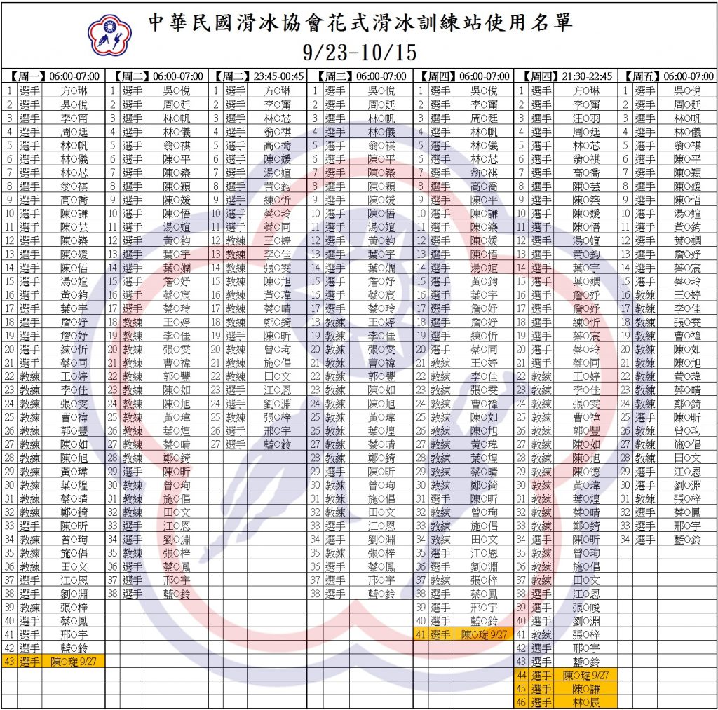 【協會公告】中華民國滑冰協會花式滑冰訓練站9/23至10/15使用名單 9/23-10/15 中華民國滑冰協會花式滑冰訓練站使用名單 *黃色標示為新增及該員可進場日期 【注意!!】依據台北市政府體育局最新防疫公告,請教練及選手們務必遵守以下事項。1.請確實配合入場量體溫、消毒、實聯制並戴口罩。2.場域容留人數為50人。(教練及選手以外,非相關人士請勿滯留於館內)3.訓練期間須全程配戴口罩(完全遮蔽口鼻)。4.出境者自返國隔日算起,完成 14 天居家檢疫及 7 天自主健康管理後,始得入場館訓練。 Previous Article 【協會公告】中華民國滑冰協會花式滑冰訓練站9/17起相關規定 Next Article 【檢定】110年度花式滑冰檢定全國賽前場次加開報名公告