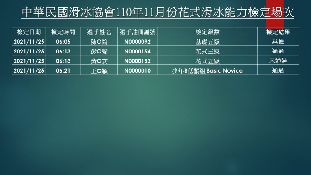 【檢定】花式滑冰能力檢定 – 110年11月份場次檢定結果 Previous Article 【檢定】花式滑冰能力檢定 – 110年11月份檢定場次公告 Next Article 【公告】民國111年中華民國滑冰協會會員會費繳納公告