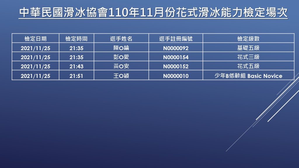 【檢定】花式滑冰能力檢定 – 110年11月份檢定場次公告 Previous Article 【成績公告】110學年度全國花式滑冰錦標賽花式組成績公告 Next Article 【檢定】花式滑冰能力檢定 – 110年11月份場次檢定結果