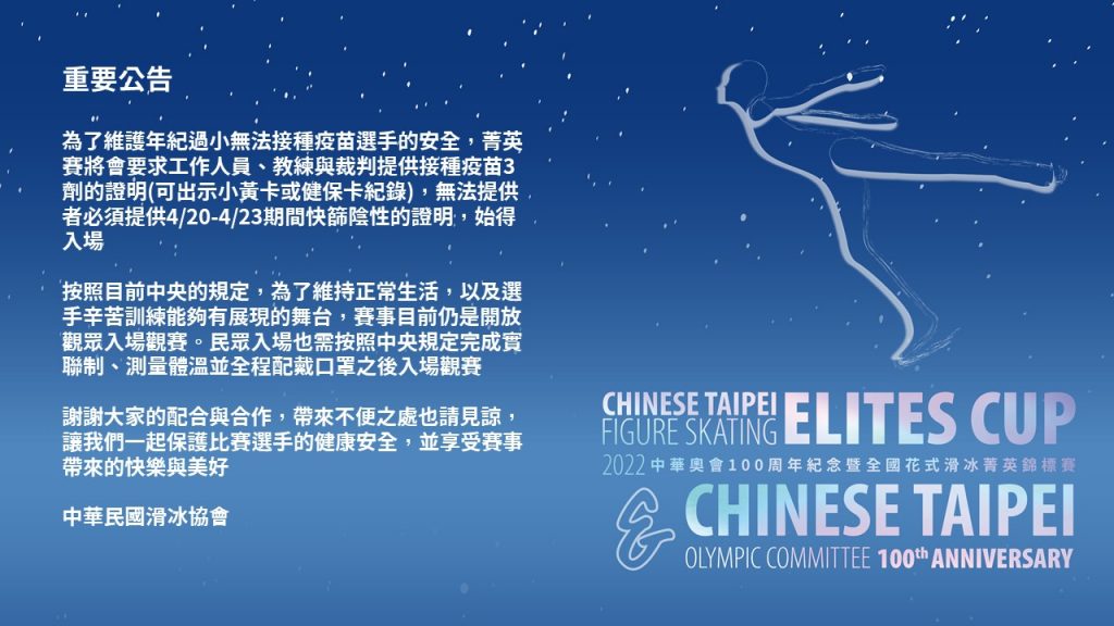 【賽事防疫公告】2002中華奧會100周年紀念暨全國花式滑冰精英錦標賽 【賽事防疫公告】2002中華奧會100周年紀念暨全國花式滑冰精英錦標賽 Previous Article 【賽事成績公告】111年全國短道競速滑冰春季錦標賽暨國手選拔賽 ─ 賽事成績 Next Article 【會務公告】中華民國滑冰協會第十三屆理事長、理事及監事選舉實施原則