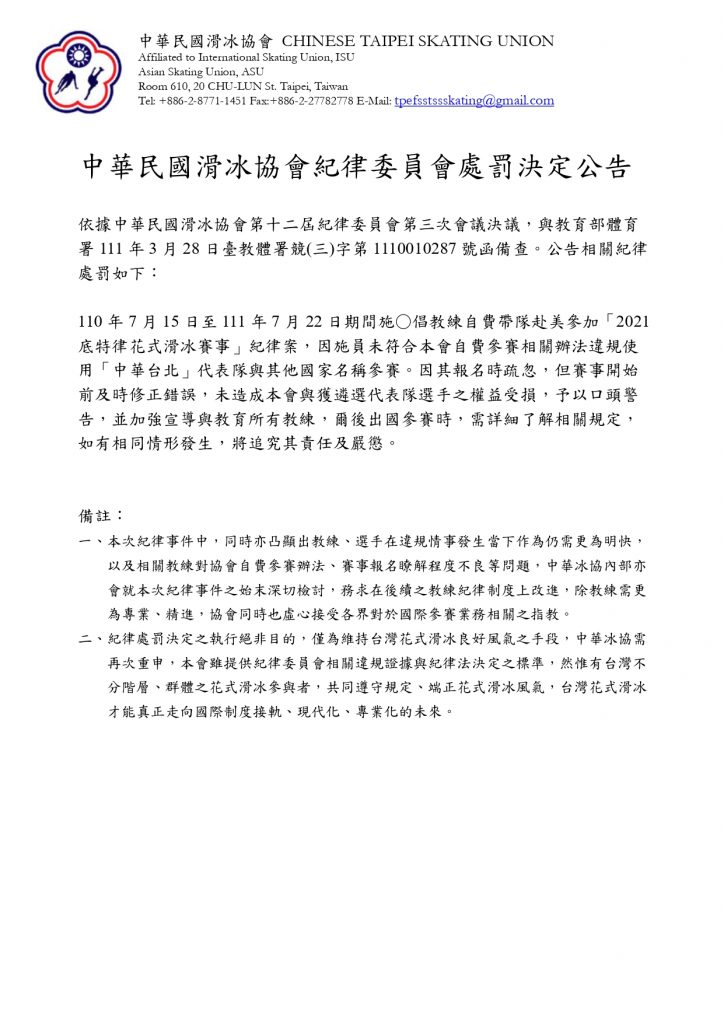 中華民國滑冰協會紀律委員會處罰決定公告-20220328-1 Previous Article [公告]111年花式滑冰選手註冊通知 Next Article 中華民國滑冰協會紀律委員會處罰決定公告-20220328-2