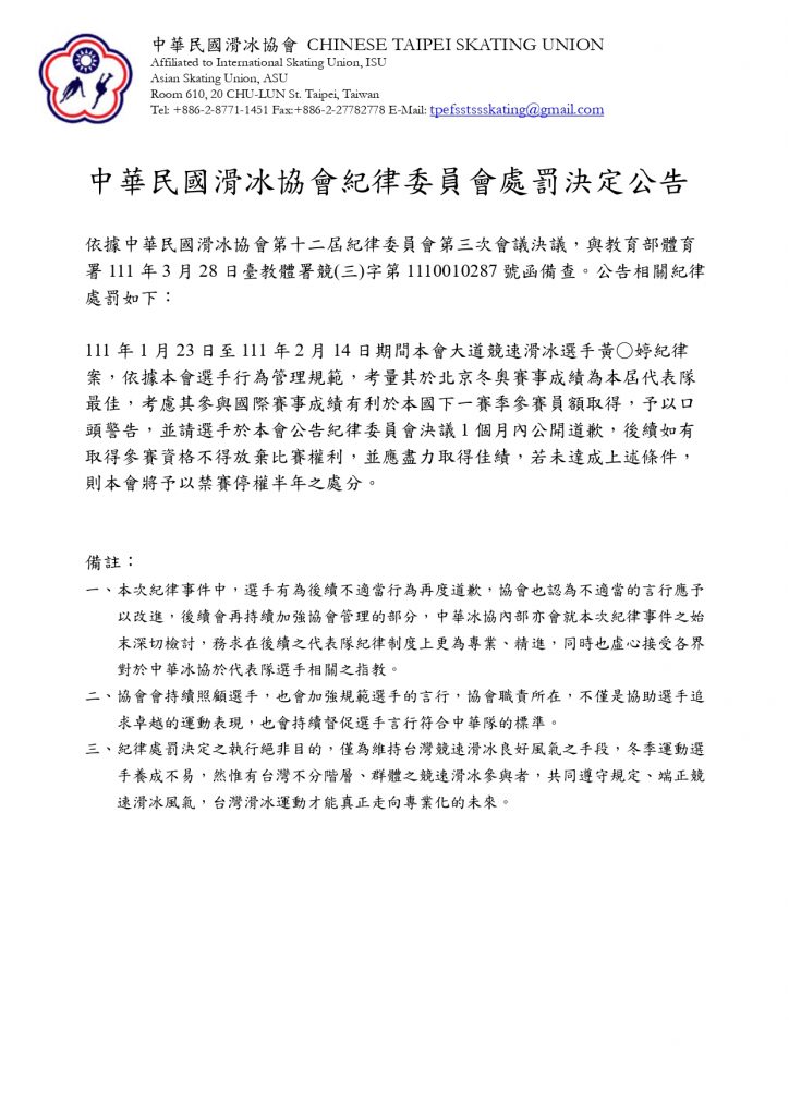 中華民國滑冰協會紀律委員會處罰決定公告-20220328-2 Previous Article 中華民國滑冰協會紀律委員會處罰決定公告-20220328-1 Next Article 2022全國花滑菁英賽 賽程 (04/21更新)
