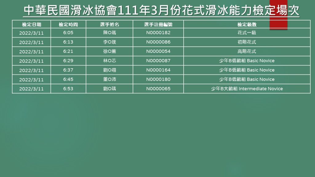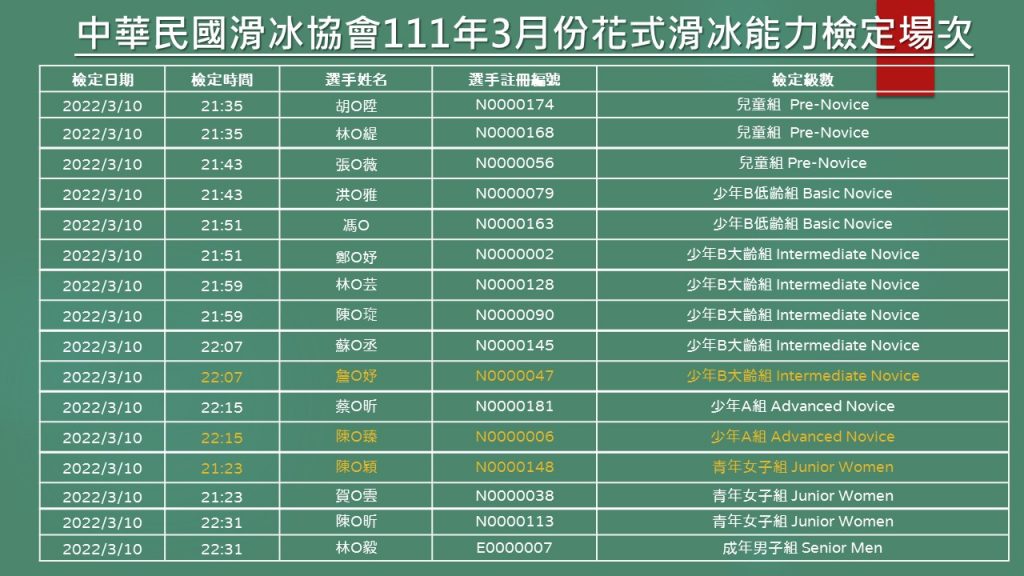 【檢定】花式滑冰能力檢定 –111年3月份檢定場次公告(3/7更新) *更新資訊:1.N0000162 選手改期 故 N0000047 備取1 遞補名額。 2.N0000148 選手改組別為 青年女子組3.N0000006 選手檢定時間更動為 22:15 Previous Article 2022花滑菁英賽賽事資訊(0303更新) Next Article [公告]111年花式滑冰教練及裁判註冊開始通知