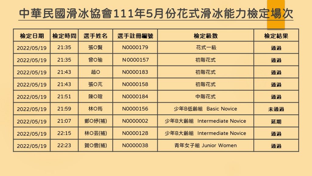 【檢定】花式滑冰能力檢定 – 111年5月份場次檢定結果 Previous Article 【協會公告】1110516-1111209花式滑冰訓練站培訓選手名單 Next Article 【公告】核發各級教練(裁判)證照效期之展延規定