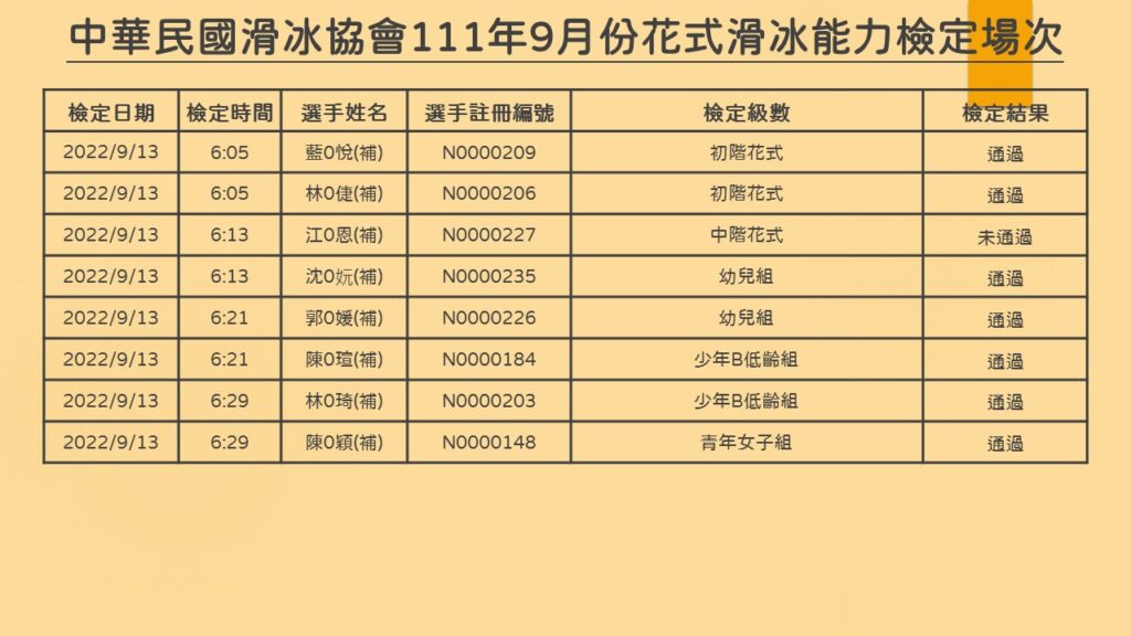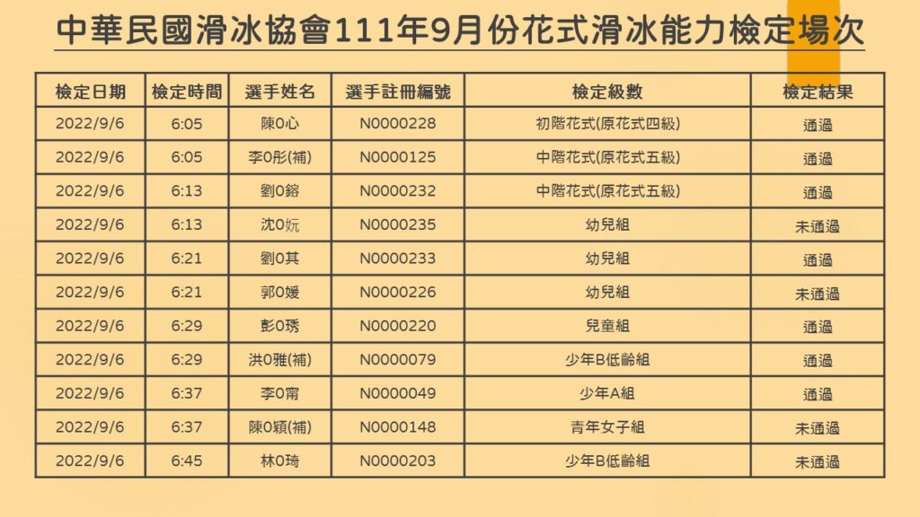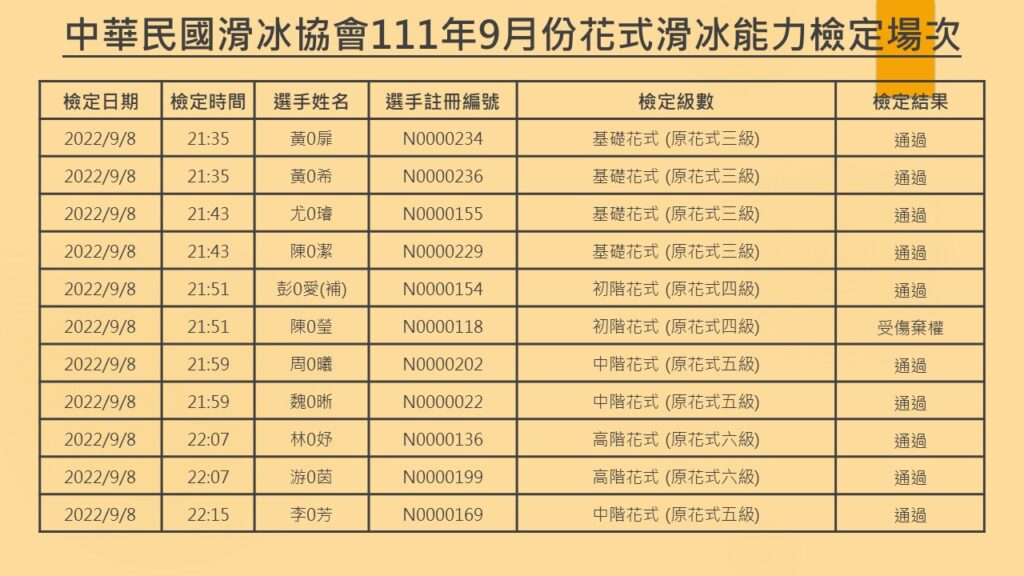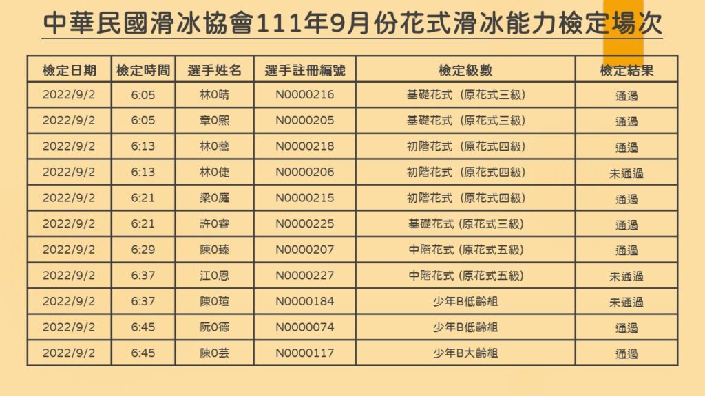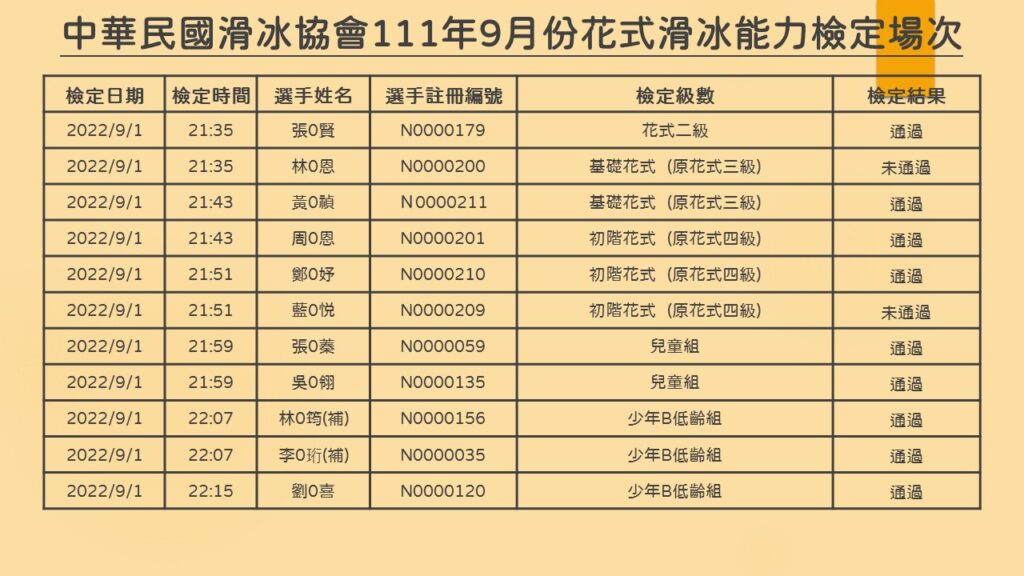 【檢定】花式滑冰能力檢定 – 111年9月份場次檢定結果-9/13更新 Previous Article 【公告】111學年度全國短道競速滑冰夏季錦標賽-新冠肺炎防疫注意事項及賽事如遇颱風措施 Next Article 【花滑檢定補考公告】111年花式滑冰檢定-補考線上報名