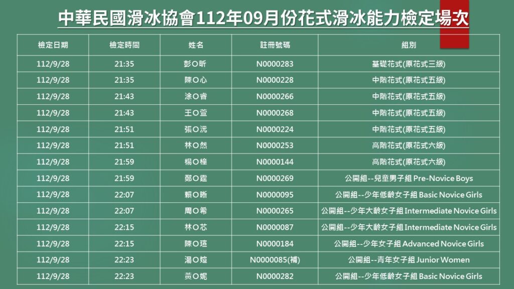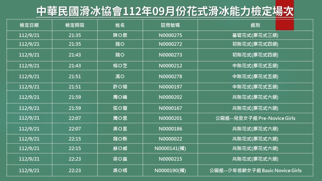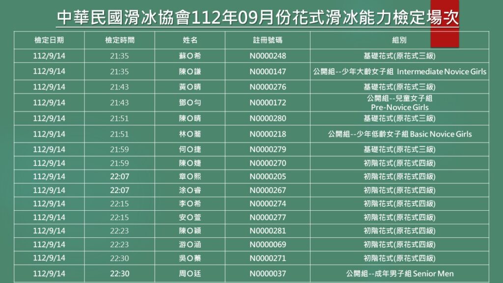 【檢定】花式滑冰能力檢定–112年9月份檢定場次公告-0918更新 Previous Article 【增能講習公告】中華民國運動總會-112年教練暨裁判增能講進修研習會(第十一梯次) Next Article 【公告】2024年ISU世界青年花式滑冰錦標賽旗手、花童徵選報名