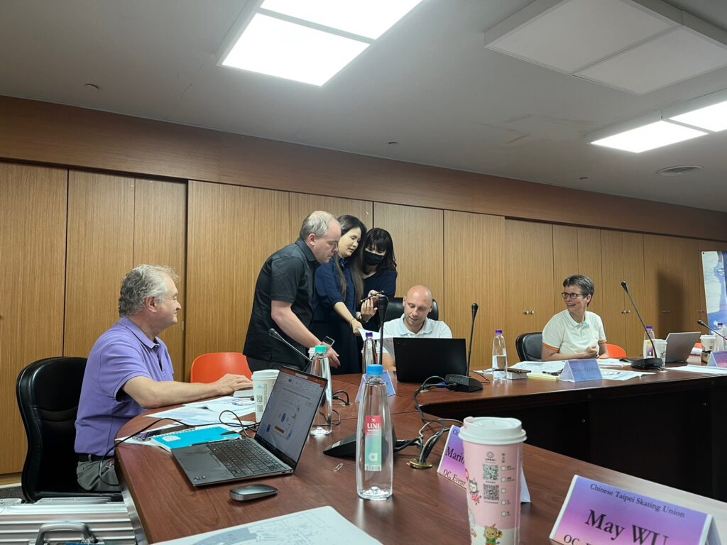 左起中華民國滑冰協會洪調進理事長暨賽事籌備委員會主席、IMG副總裁安達斯沙利先生(András Sallay)、國際滑冰總會賽會執行官員威蘭.路德先生(Wieland Lüders)及賽會執行助理茱莉亞.迪根赫佐女士(Julia Degenhardt)、賽事顧問瑪利歐.梅聶先生(Mario Meinel)、中華民國滑冰協會李慧娟監事長與吳倫閑秘書長。