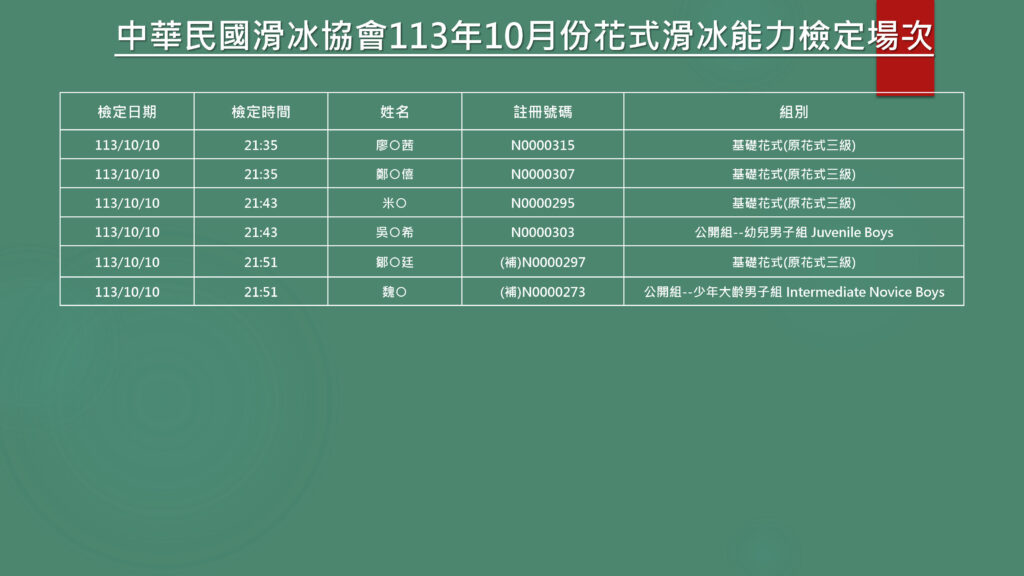【檢定】花式滑冰能力檢定–113年10月份檢定場次公告 Previous Article 【賽事公告】113學年度全國花式滑冰錦標賽競賽規程、技術手冊及報名連結 Next Article 【增能講習公告】中華民國運動總會-113年教練暨裁判增能講進修研習會(第十五梯次)