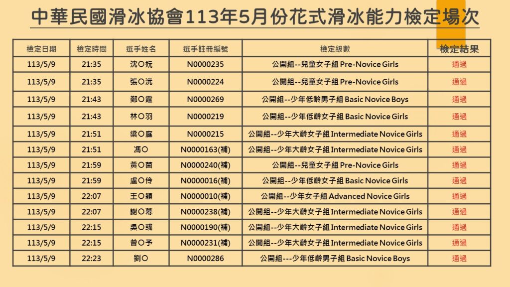 【檢定】花式滑冰能力檢定–113年5月份檢定場次成績公告 Previous Article 【賽事公告】113年全國花式滑冰菁英錦標賽競賽規程、技術手冊及報名連結-0514技術手冊、0515競賽規程更新 Next Article 【賽事公告】113年全國花式滑冰菁英錦標賽出場序、練習時間表及賽程表-0521更新