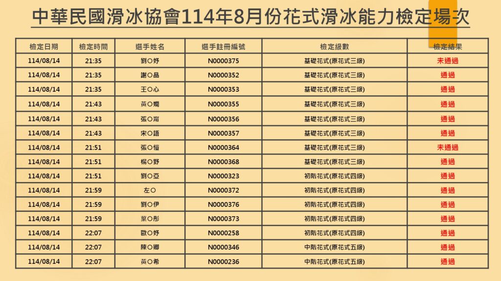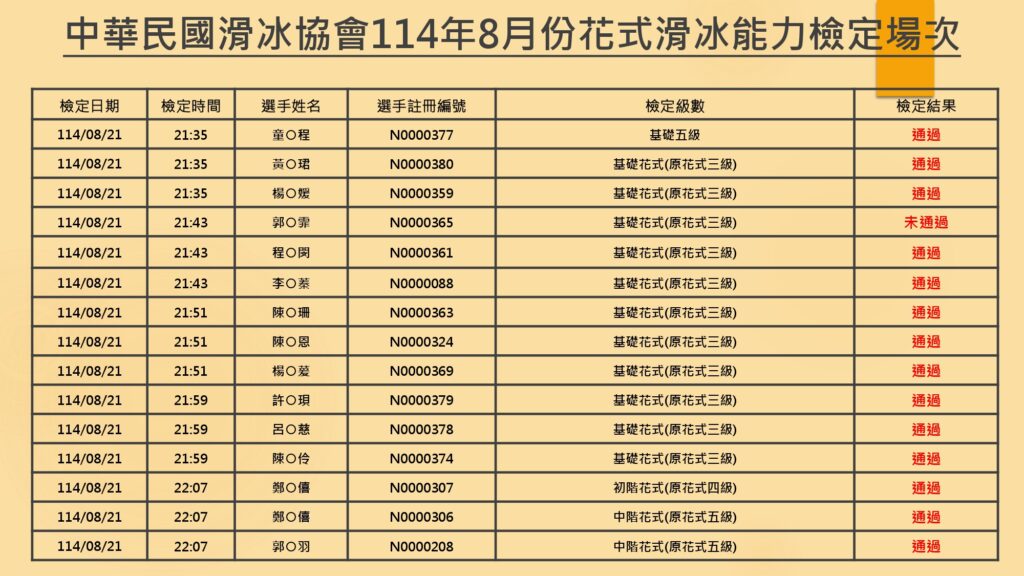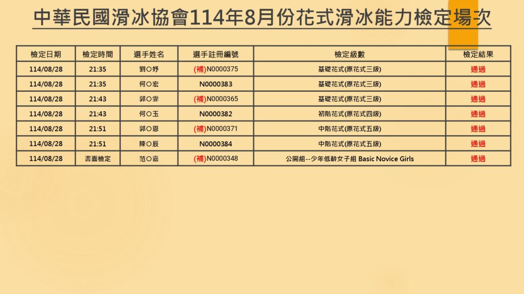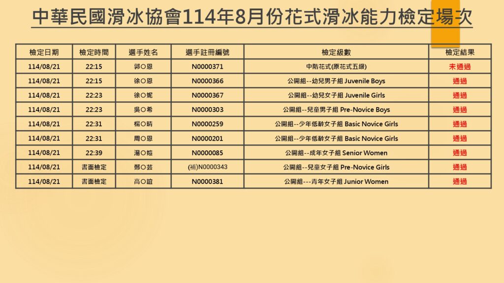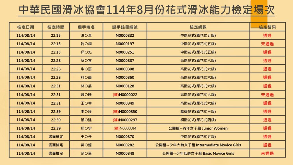 【檢定】花式滑冰能力檢定 – 114年8月份場次檢定結果-update1140829 Previous Article 【公告】2025 ISU青年花式滑冰大獎賽第四站-泰國站投保事宜 Next Article 【檢定公告】114年8月份花式滑冰檢定補考場次已開放報名