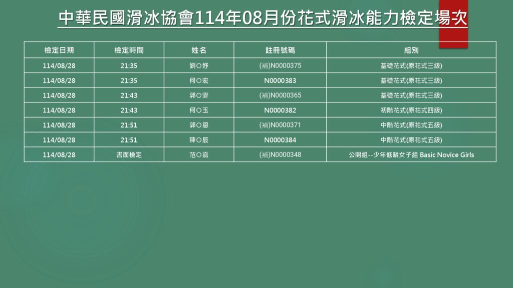 【檢定】花式滑冰能力檢定–114年8月份加開檢定場次公告及公益時段調整 因加開花式滑冰檢定場次,原定8/28晚上花式滑冰公益時段延後為晚上10點後開始,請各位選手及教練注意,造成不便,敬請見諒! Previous Article 【賽事公告】114學年度全國花式滑冰錦標賽媒體採訪及家長攝影申請 Next Article 【賀】中華代表隊參加2025 ASU亞洲短道競速滑冰錦標賽獲得5金5銀6銅佳績