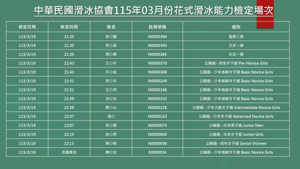 【檢定】花式滑冰能力檢定–115年3月份檢定場次公告 Previous Article 【轉知】2026國際奧林匹克路跑活動簡章 Next Article 【講習公告】2026/27 花式滑冰新規講座|開放報名中!