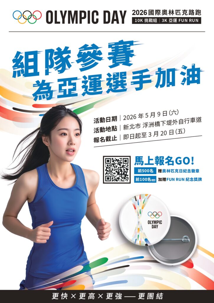【轉知】2026國際奧林匹克路跑活動簡章 依中華奧林匹克委員會115年3月12日華奧企字第11500005341號函轉知推廣奧林匹克精神,鼓勵全民培養規律運動習慣,特辦理2026國際奧林匹克路跑活動。今年適逢亞洲運動會年,盼藉由活動凝聚社會力量,為我國代表隊選手加油應援,共同支持體育與健康生活的運動風氣。 日期: 115年5月9日 地點:新北市板橋區浮洲橋下堤外自行道 報名網址: https://bao-ming.com/eb/content/6863#32414 Previous Article 【公告】2026全國花式滑冰菁英錦標賽抽籤時間異動 No Newer Articles